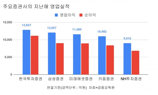 16일 금융투자업계에 따르면 삼성증권·미래에셋증권·한국투자증권·키움증권이 지난해 1조원이 넘는 영업이익을 올렸고 NH투자증권도 1조원에 근접했다.
