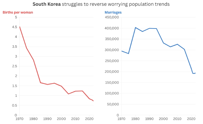 한국은 경제협력개발기구(OECD) 회원국 중 출산율이 가장 낮은 국가로 2023년 기준 여성 1명당 출산율이 0.72명에 불과했다. 한국 정부는 2006년 이후 약 2000억 달러(약 289조 원)에 달하는 저출산 대책을 추진했으나 효과는 미미했다.
