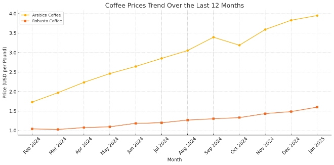 22일(현지 시각) 뉴욕타임스(NYT)에 따르면 뉴욕 선물거래소에서 거래되는 아라비카 커피 선물 가격은 파운드당 4달러(약 5800원)에 근접하며 지난 1977년 이후 최고치를 기록했다. 이는 지난해 같은 기간 대비 120% 상승한 수준이다. 로부스타 커피 가격도 1.5달러(약 2160원)를 넘어 30년 만에 최고치를 경신했다.