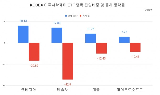 테슬라는 올해 42.90%, 엔비디아는 올해 20.89% 각각 급락했다. 애플(-12.43%) 마이크로소프트(-10.45%) 등도 부진하다. 이 기간 나스닥은 9.71% 하락했다.