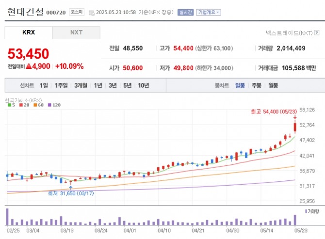 이미지 확대보기23일 한국거래소에 따르면 원전주로 분류되는 현대건설의 주식은 오전 10시58분 전일보다 10.09% 뛴 5만3450원을 기록 중이다. 장중 5만4400원을 찍으며 52주 신고가를 경신했다.