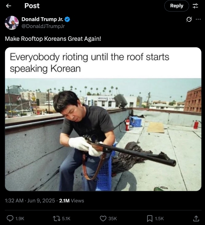 이미지 확대보기인디펜던트에 따르면 트럼프 주니어는 이날 X에 올린 글에서 “루프톱 코리안을 다시 위대하게 만들자(Make Rooftop Koreans Great Again!)”는 문구와 함께 지난 1992년 LA 폭동 당시 총기를 들고 건물 옥상에서 가게를 지키는 한국계 이민자의 모습을 담은 밈을 게시했다. 트럼프 주니어의 이같은 표현은 단순한 역사적 언급이라기보다 최근 격화된 시위 상황에 시민들이 무장을 통해 직접 개입해야 한다는 식의 메시지로 해석될 여지가 크다는 지적이 나오고 있다.