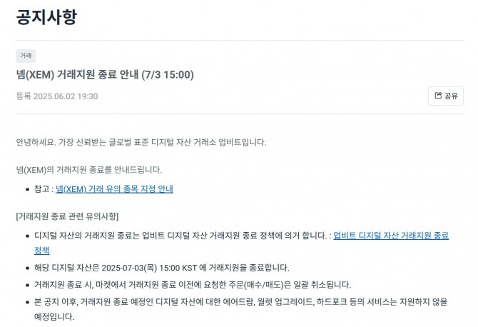 하지만 이 같은 인기는 오래 가지 못했다. 넴은 주로 일본에서 수요가 컸지만 그 인기가 차츰 시들면서 지난해 기준으로는 넴(XEM) 코인의 전 세계 거래량의 94%가 업비트에서 발생하기도 했다. 그러나 최근 하루 거래량이 10억 원 미만으로 떨어진데다 타 지역에서 거의 거래가 발생하지 않아 거래지원 종료가 예견됐었다.