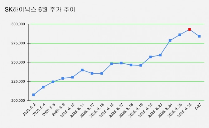 27일 한국거래소에 따르면 SK하이닉스는 이날 3.07%(9000원) 내린 28만4000원에 거래를 마감했지만 이달 들어 38.87%나 올랐고 최근 들어 5거래일 연속 오르며 신고가를 갈아치우기도 했다.