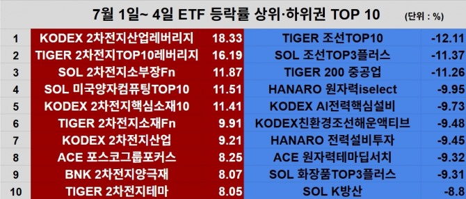 이미지 확대보기6일 한국거래소에 따르면 지난 1일부터 4일까지 7월 ETF 수익률 상위권은 대부분 2차전지 관련 상품이 차지했다. 'KODEX 2차전지산업레버리지' ETF가 18.33% 급등하며 수익률 1위를 기록했고, 'TIGER 2차전지TOP10레버리지'는 16.19% 상승해 뒤를 이었다. 'SOL 2차전지소부장Fn'(11.87%), 'KODEX 2차전지핵심소재10'(11.41%), 'TIGER 2차전지소재Fn'(9.91%) 등도 상위권에 이름을 올리며 10개 종목 중 9개 종목이 2차전지 관련 상품으로 집계됐다.