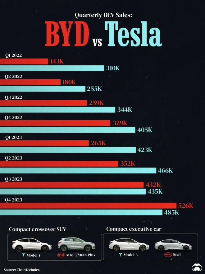 21일(이하 현지시각) 인베스터스비즈니스데일리(IBD)에 따르면 테슬라는 올해 2분기 실적에서 전년 동기 대비 40% 가까운 순익 감소가 예상되고 있으며 차량 인도량 역시 줄었다. 반면 비야디는 올해 1분기 순익이 테슬라를 처음으로 앞질렀고 판매량과 글로벌 확장세도 이어가고 있다.