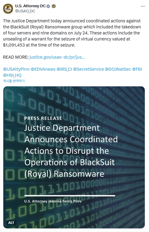 “의료·정부·제조업 등 450여 곳 공격한 이중 갈취조직 암호자산 100만 달러 압수”