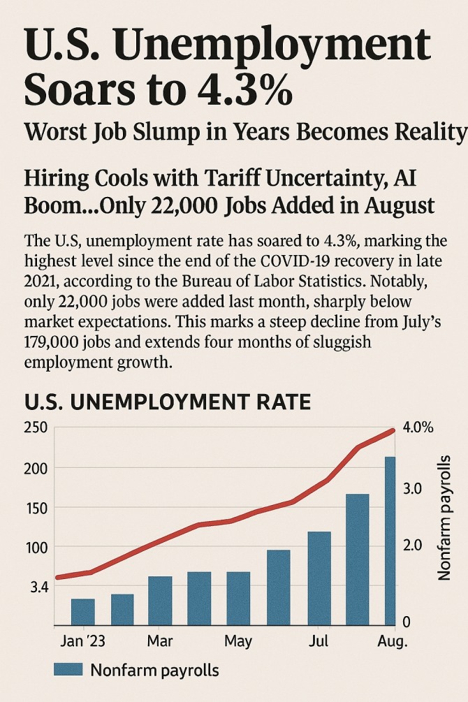 이미지 확대보기미국 노동통계청에 따르면, 미국 실업률은 4.3%까지 치솟으며 코로나19 회복기인 2021년 말 이후 가장 높은 수치를 기록했다. 특히 지난달 신규 고용은 2만2000명에 그쳐 시장 예상치를 크게 밑돌았다. 이는 전월 7만9000명에서 급감한 수치로 4개월 연속 부진한 고용 증가세가 이어졌다.