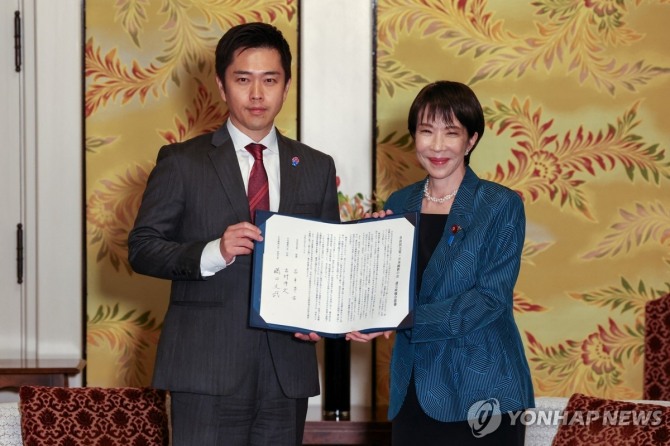 이미지 확대보기다카이치 총재와 유신회 요시무라 히로후미 대표는 이날 도쿄에서 만나 연정 수립을 위한 합의서에 서명했다.