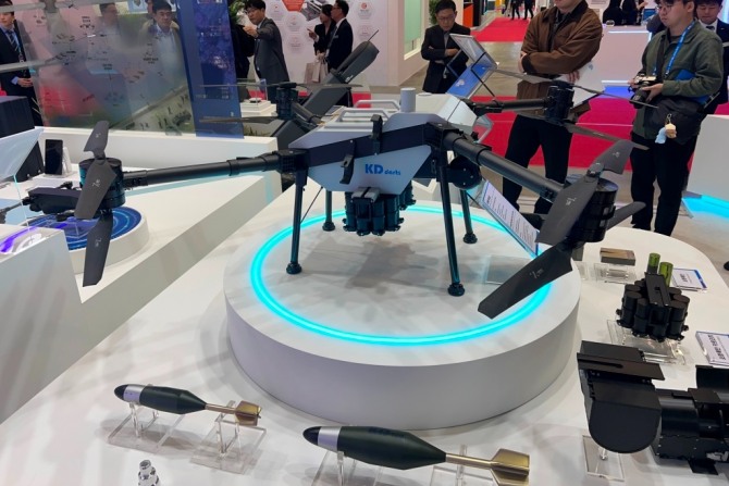 코리아디펜스인더스터리가 공개한 소형 탄약 투하 드론은 탄소섬유 복합재로 제작한 전기 수직이착륙(VTOL) 무인기다. 작동 중량 1525kg에 최대 8kg의 탄약을 실을 수 있으며, 30분 이상 자율 비행한다. 300~500m 고도에서 비행하도록 설계했고, 50m 이상 비행할 때 300데시벨(dB) 미만의 낮은 소음으로 은밀한 접근과 교전을 보장한다.