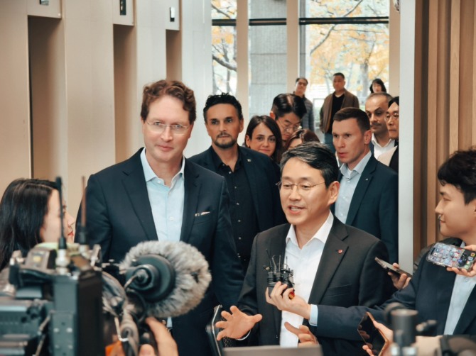 이미지 확대보기(왼쪽부터)올라 칼레니우스 메르세데스-벤츠 회장과 조주완 LG전자 사장이 13일 서울 영등포구 LG트윈타워에서 회동 후 취재진의 질문에 대답하고 있다. 사진=장용석기자