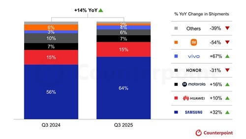 6일 시장조사업체 카운터포인트리서치에 따르면 올해 3분기 글로벌 폴더블폰 출하량 기준 점유율에서 삼성전자는 64%를 기록했다. 이는 전년 동기 대비 8%포인트 상승한 수치다. 지난해 3분기 56%였던 삼성전자의 점유율은 같은 기간 더욱 확대되며 시장 내 영향력이 강화됐다.