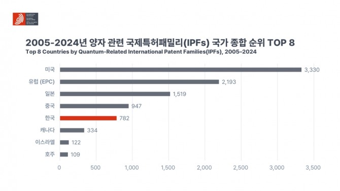 한국은 2005~2024년 동안 총 782건의 양자 관련 IPFs를 출원하며 미국·유럽(EPC)·일본·중국에 이어 세계 5위에 올랐다. 세부적으로는 양자 통신 분야 특허가 665건으로 가장 큰 비중을 차지했고 양자 컴퓨팅 분야도 88건으로 뒤를 이었다.