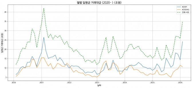 이미지 확대보기11일 글로벌이코노믹이 집계한 결과 1월 중 유가증권시장과 코스닥시장을 합산한 일평균 거래대금은 34조7800억원으로 집계됐다. 이는 2025년 연간 일평균 거래대금(19조6400억원) 대비 77% 확대된 수치다. 지수 상승과 함께 실제 매매 참여가 동반 확대되면서, 그간 관망세를 유지하던 자금이 다시 시장 안으로 유입되고 있다는 평가가 나온다.