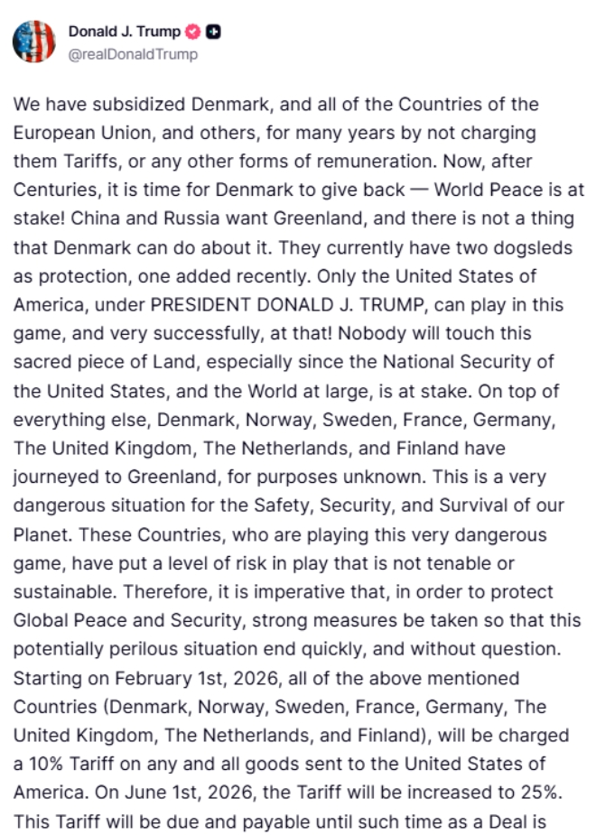 트럼프 대통령은 덴마크를 비롯한 유럽 8개국이 그린란드에 군사 인력을 파견한 데 대한 보복으로 미국 수출품 전반에 고율 관세를 부과하겠다고 밝혔다.