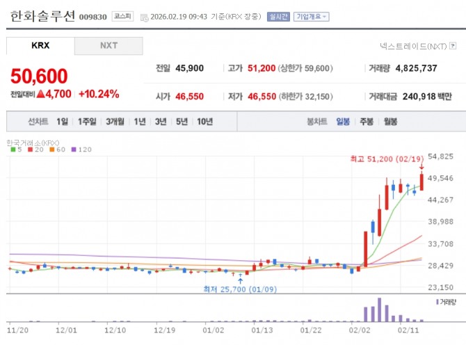 이미지 확대보기19일 한국거래소에 따르면 이날 오전 9시43분 현재 한화솔루션은 전거래일 대비 10.24% 오른 5만600원에 거래 중이다. 장중 전장 대비 11.55% 급등한 5만1200원까지 치솟기도 했다.