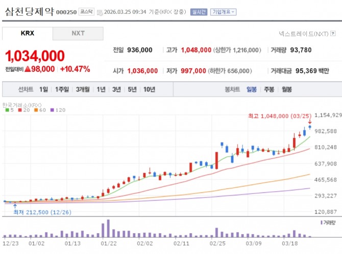 이미지 확대보기25일 한국거래소에 따르면 이날 오전 9시 34분 기준 삼천당제약은 전 거래일 대비 10.47% 오른 103만4000원에 거래되고 있다.