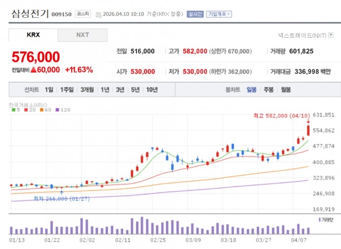 이미지 확대보기10일 한국거래소에 따르면 오전 10시 10분 현재 삼성전기는 전장보다 11.63% 오른 57만6000원에 거래되고 있다.